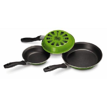 Zestaw 3 patelni średnica 18, 22 i 26 cmWykonanie: Boki: stal nierdzewna emaliowana 1,4 mm grubości. Wnętrze: Nieprzywierająca powłoka Xylan Plus Bakelitowy uchwyt z zabezpieczeniem przed płomieniem Dodatkowa ochrona brzegów - pokrycie stalą nierdzewną Łatwe w czyszczeniu. Odporne na wysokie temperatury Do wszystkich rodzajów płyt, także indukcyjnych. |