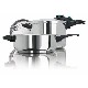 Zestaw dwóch garnków ciśnieniowych,pojemność: 6 i 4 litry, automatycznie zamykana pokrywa, system zaworów z 2 poziomami ciśnienia, zawór samoczyszczący (możliwość demontażu zaworu do samodzielnego wyczyszczenia) kontrolowane rozszczelnianie, dno z wkładem aluminiowym szybko rozprowadzającym ciepło, do użytku na wszystkich rodzajach kuchenek, także indukcyjnych, dodatkowo perforowany koszyk ze stali nierdzewnej z tarką do jarzyn |